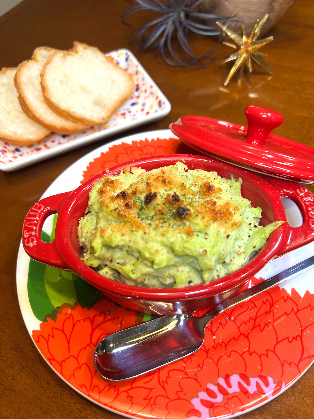 3)2)を耐熱皿に盛り粉チーズを振りかけてトースターで3〜4分焼く。