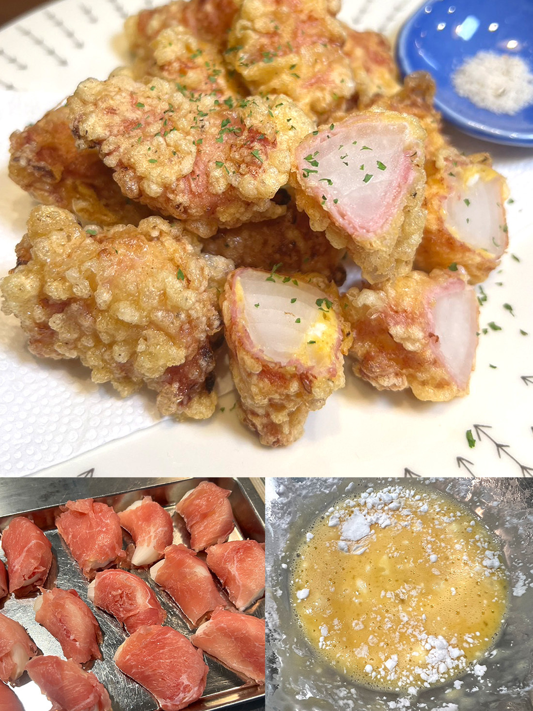 4)2)を3にくぐらせ170℃に熱した油で3分程揚げる。
