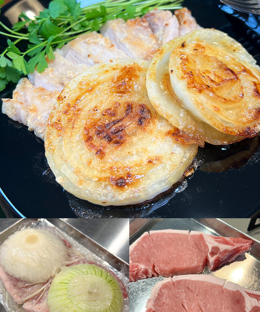 3)玉葱、豚肉、両面にスプーン等で塩麹をたっぷり塗り込み、豚肉を玉葱で挟むようにしてトレーに並べてラップをし、冷蔵庫で4〜5時間寝かせる。