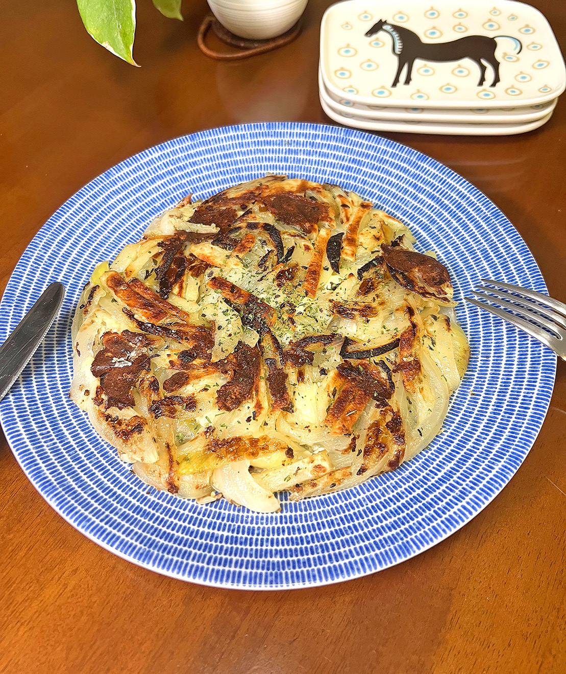 玉ねぎのしゃきっとした食感がプレーンなガレットとまた違った味わいが楽しめます。夕飯の前菜、朝食、お弁当のおかずなどにいかがでしょうか。