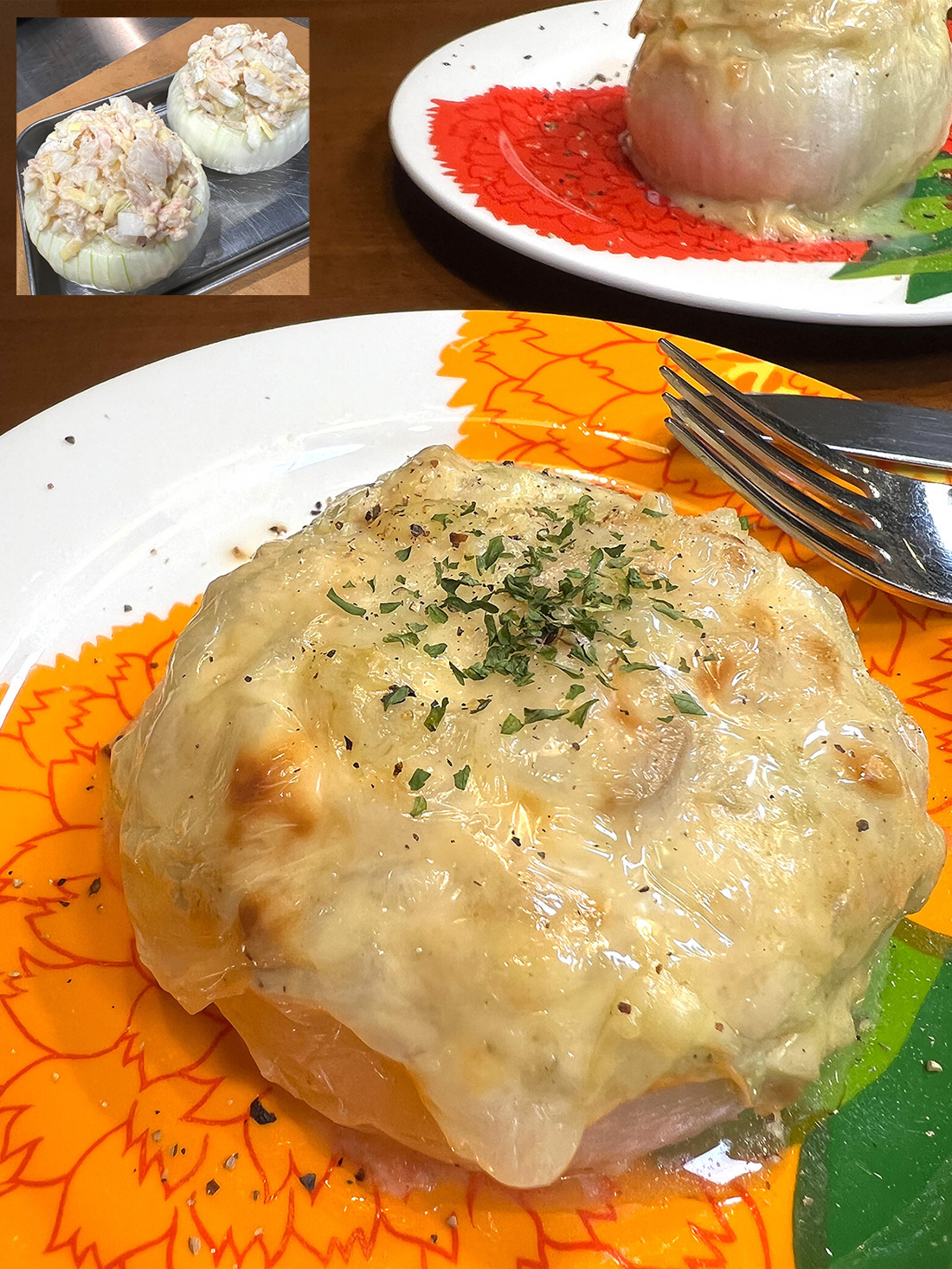 新鮮な新玉葱ぎほど水分が多いので、レンジで温めた際に中身がとろけ出てしまう事があります。スプーンなどですくって詰め直せば大丈夫です。