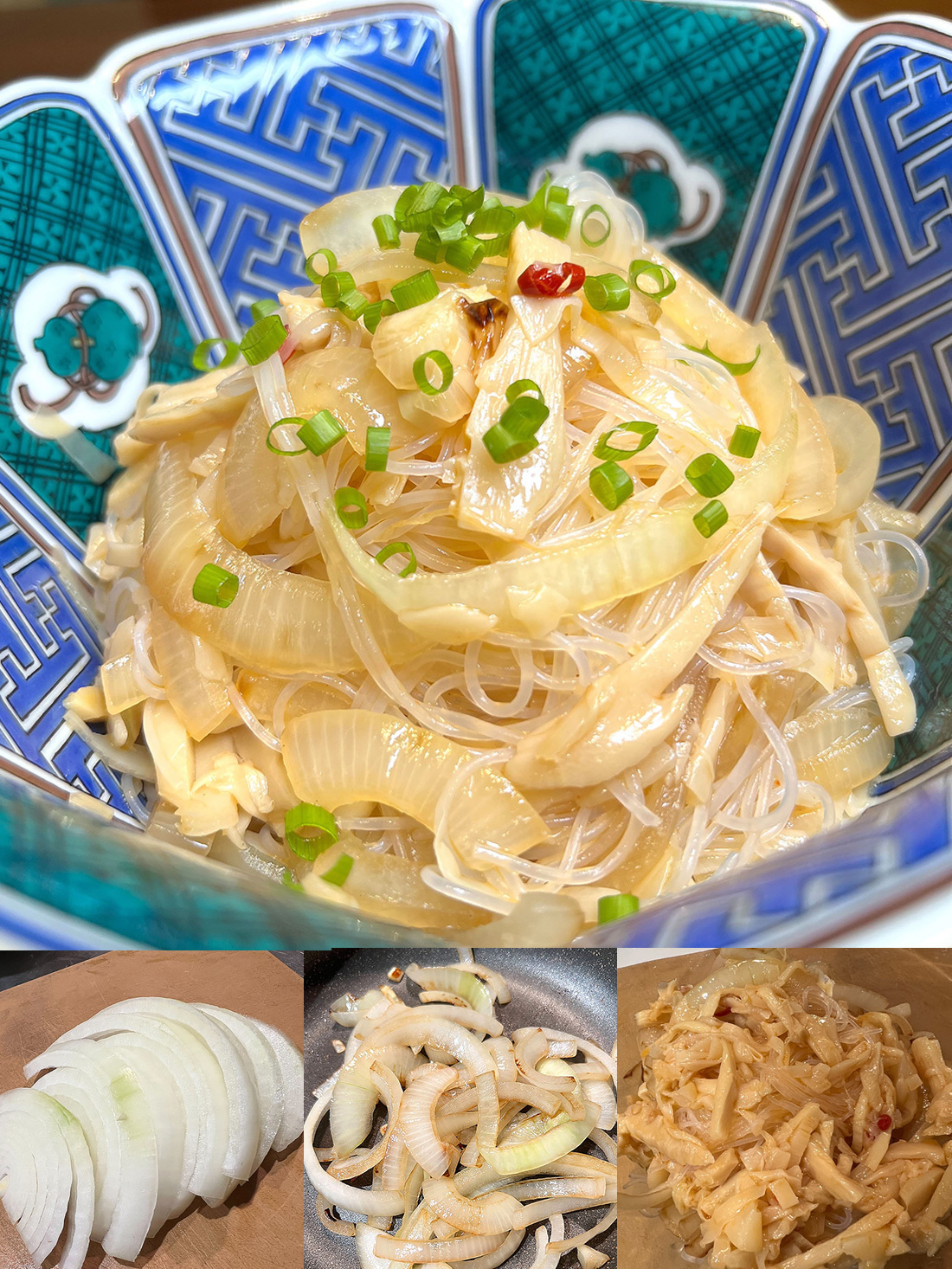 玉葱を炒めて和える事で玉ねぎの甘みを先に感じ後からメンマの食感と辣油のピリッとした辛みを楽しめます。