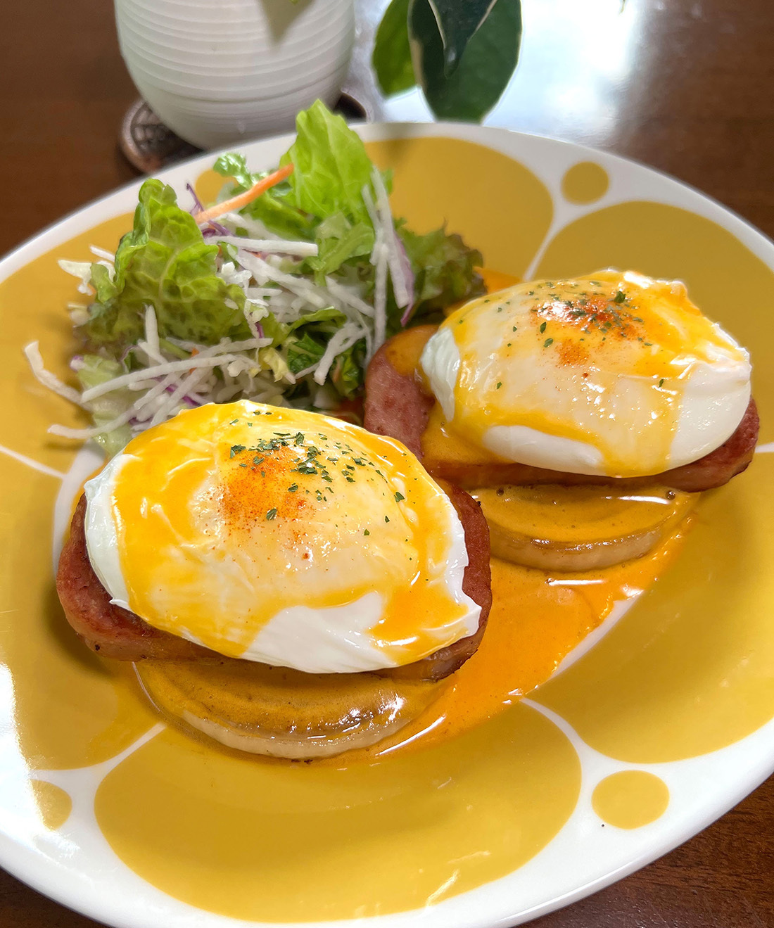 4)2)の玉葱、スパムの順にお皿に盛りつけ3)のポーチドエッグをのせて1)のソースをかけ、パプリカパウダーとパセリをふって出来上がり。