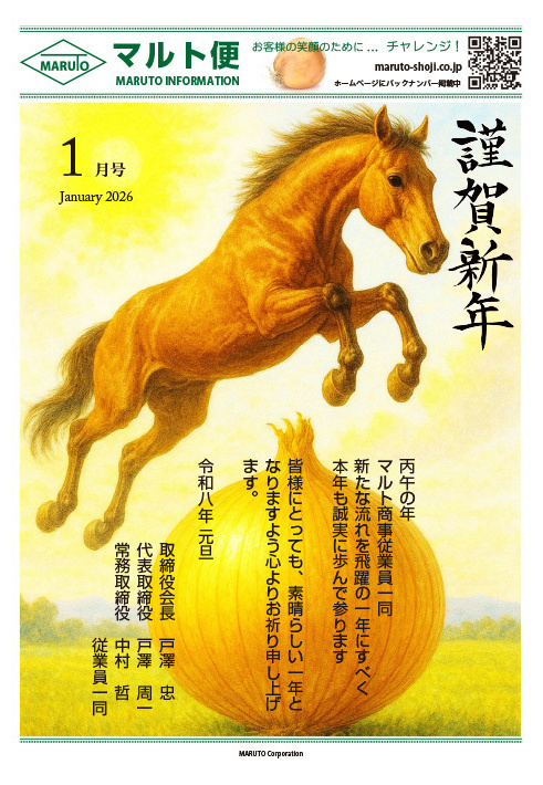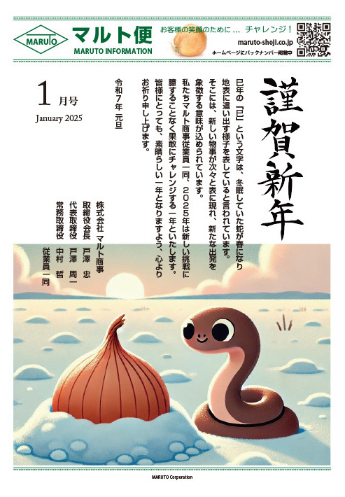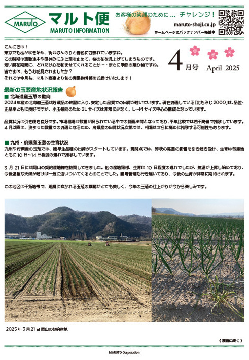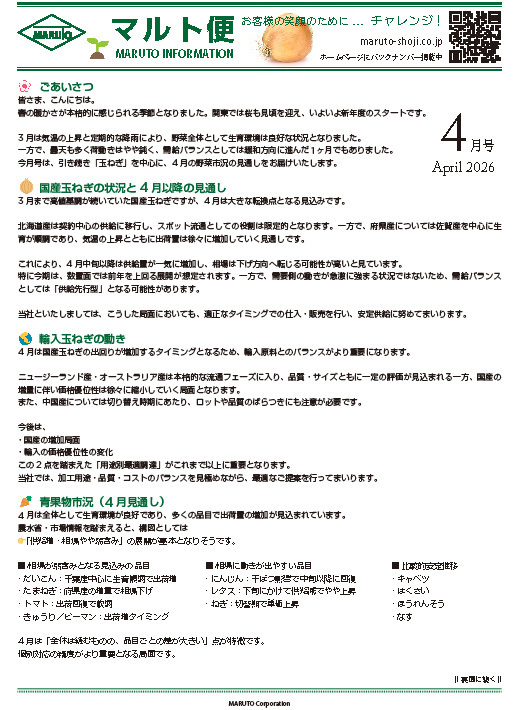 マルト便 2026年4月号 国産玉ねぎの状況と4月の見通し 輸入玉ねぎの動き 青果物市況(4月見通し) 2026年3月号 国産玉ねぎの状況と3月の見通し 輸入玉ねぎの動き 青果物市況 2026年2月号 国産玉ねぎの状況と2月以降の見通し 輸入玉ねぎの動き 青果物市況 2026年1月号 謹賀新年 『玉ねぎザックリ野菜ポトフ』 2025年12月号 国産玉ねぎの状況と年末年始の見通し 輸入玉ねぎの動き 『玉ねぎステーキホワイトソースがけ』 2025年11月号 北海道産玉葱の生育・生産動向 青果物市況 『玉ねぎとさつまいものサラダ』 2025年10月号 北海道産玉ねぎの最新状況 加工業務用玉葱の動向 『玉ねぎザックリ鶏つくね丼』 2025年9月号 最新の玉葱産地状況報告 最新の青果物業界ニュース 『和風玉ねぎカプレーゼ』 2025年8月号 北海道産玉葱の生育・生産動向 産地訪問報告 『玉葱スパニッシュオムレツ』 2025年7月号 最新の玉葱産地状況報告 府県産玉葱の動向 『玉葱の梅しそマリネ』 2025年6月号 最新の玉葱産地状況報告 注目野菜:にんじんの動向 『玉葱ビシソワーズ』 2025年5月号 北海道産玉葱の動向 府県産玉葱の状況 『新玉葱丸ごとグラタン』 2025年4月号 最新の玉葱産地状況報告 最新の青果物業界ニュース 『新玉葱と菜の花のサラダ ハニーマスタードソース合え』 2025年3月号 府県産玉葱の状況 野菜全般の価格動向 『玉葱ステーキレモンバターソースかけ』 2025年2月号 北海道産玉葱の動向 2025年1月 野菜高騰の動き 『玉葱のカレー天津飯』 2025年1月号 謹賀新年 玉葱を使ったおすすめ料理 『玉葱春雨メンマ合え』 2024年度 2023年度 2022年度 2021年度 2020年度 2019年度 2018年度 2017年度 2016年度 2015年度