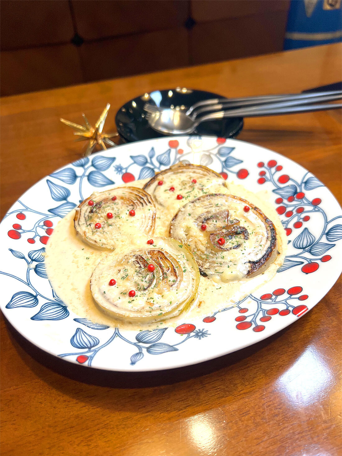 4)盛り付けた玉ねぎに3のクリームソースをかければ出来上がり。仕上げにピンクペッパー、パセリ等を振り上げると華やかになります。