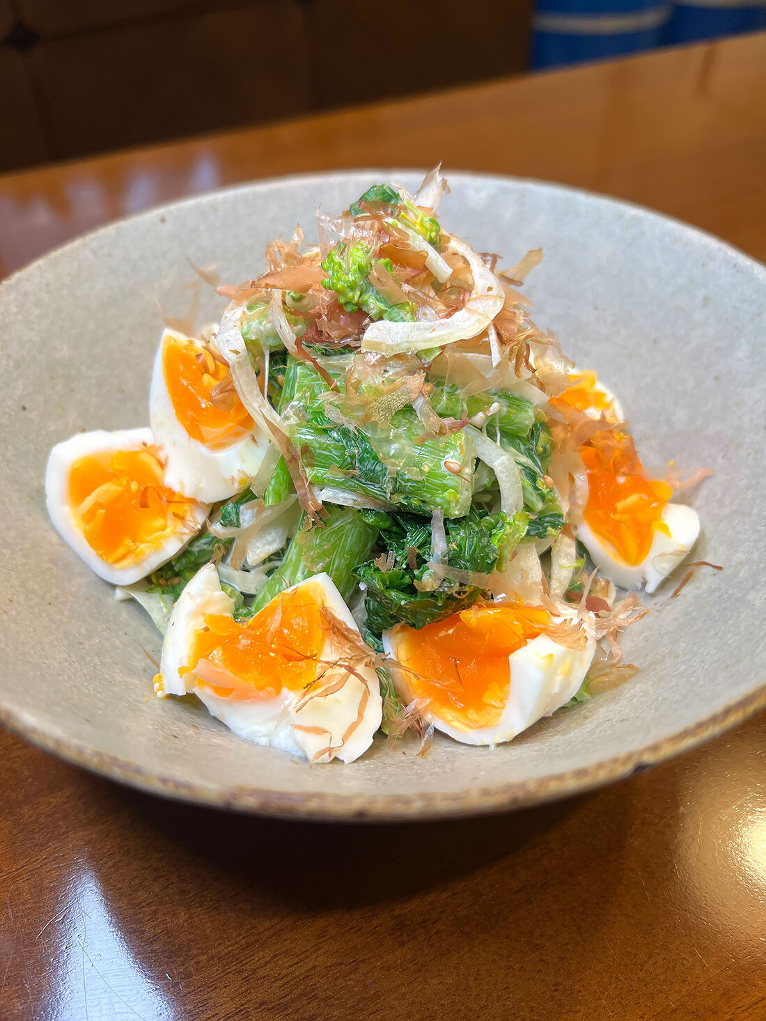 5)卵を盛り付け鰹節を振りかけて完成。
